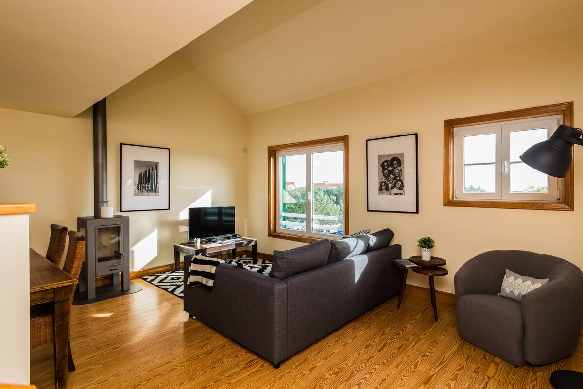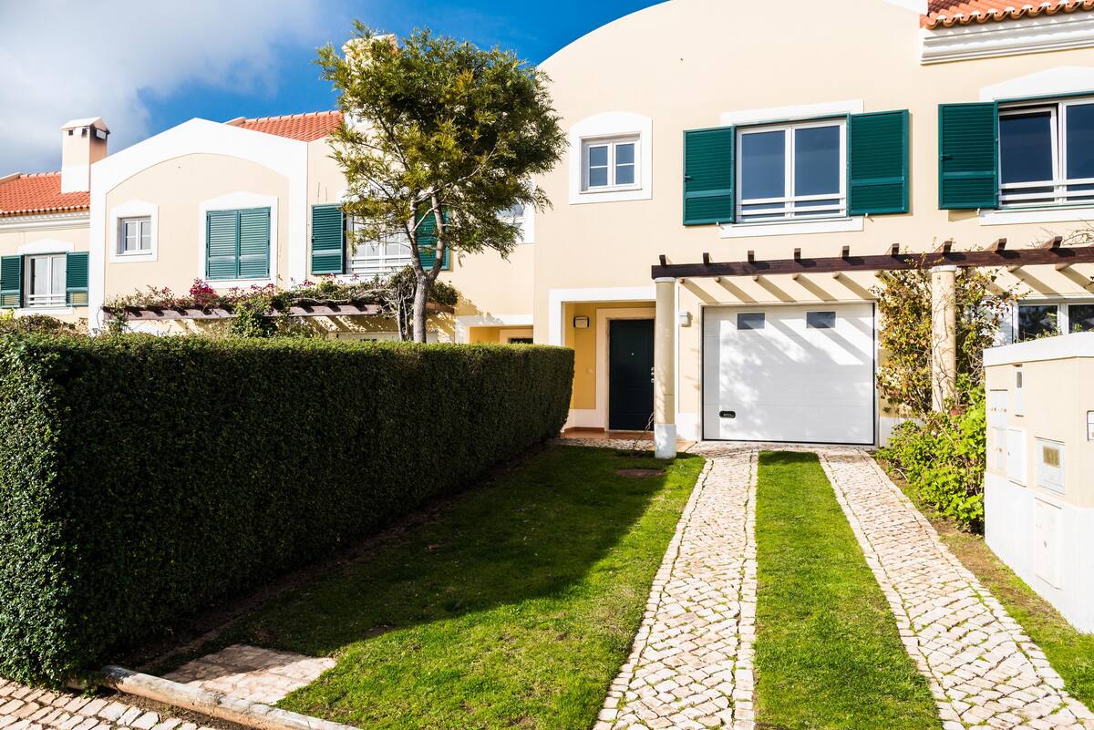 Private villa fully furnished with 200 m2 , 5min to the Guincho Beach. It accomodates 6 people, includes 1 bedrooms with double bed, a mezannine with double sofa bed, and a double sofa bed on the living room, 2 bathrooms, fully equipped kitchen with dining area and private terrace with garden. It as TV, DVD, Wi-fi, bed sheets and towels included. It is located in a private condominium, with wide green areas, security, outdoor shared pool and tennis court. Good for golfers, surfers and windsurfers. It is 5min car to the beach, and 10min car to cascais center (restaurants, shops and other beaches), 25 min by car to Lisbon airport or 45 min by train and subway.